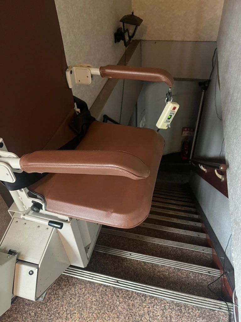 しっかりとした椅子型のシートに座って移動します。手すりと足置き、安全ベルトが完備されており、揺れの少ないスムーズな動きで2階へ上がれます。