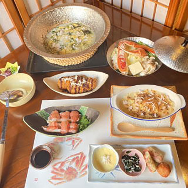 かにグラタン・かにクリームコロッケ・蒸しがに・ご飯・漬物・デザート